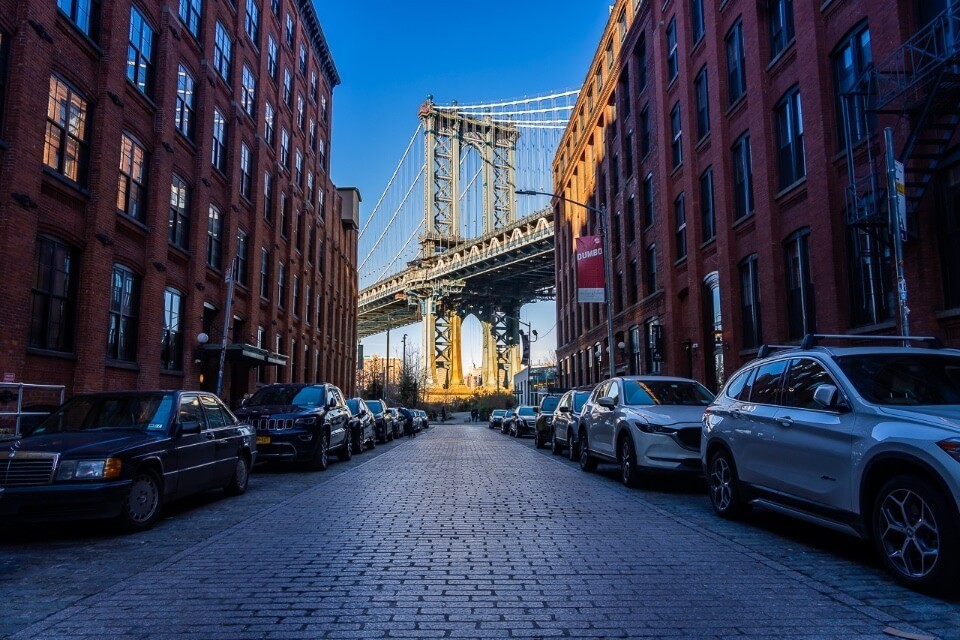 This viewpoint is one of our favorite photo spots in NYC and we tried 3 sunrises here without ever having it to ourselves. During the day it’s even busier, so expect to see a lot of people doing photo shoots. Walk around to Pebble Beach and Jane’s Carousel for awesome Brooklyn Bridge Views, then go to the Time Out Market rooftop to grab food and drinks. There’s another great bridge view from the roof too.
