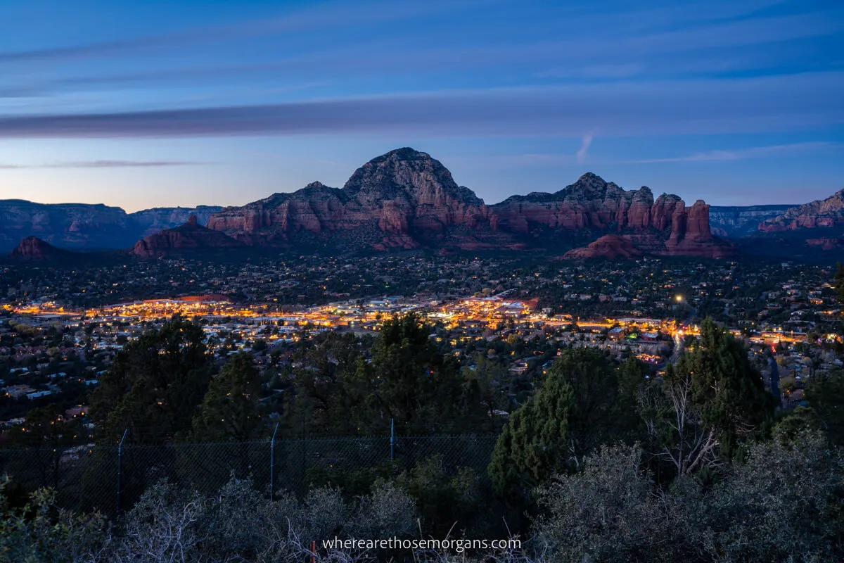 We really enjoyed the sunset view from Airport Mesa scenic viewpoint. After setting up our tripod and camera, we watched the sun disappear and stayed for 30 minutes more to see downtown light up and wait for the sky to transform into deeper colors. We recommend hiking back up Sedona View Trail to arrive around 30 minutes before sunset time (check times here).
