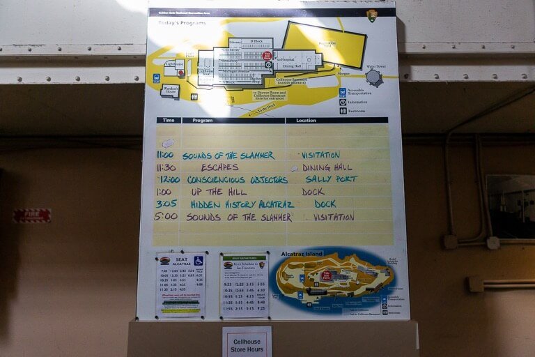 Make sure you stay long enough to see what special programs are offered on that day. There will also be a ferry schedule sign nearby so check what time the ferry is headed back to Pier 33. From here, our large group was lead to the cellhouse.