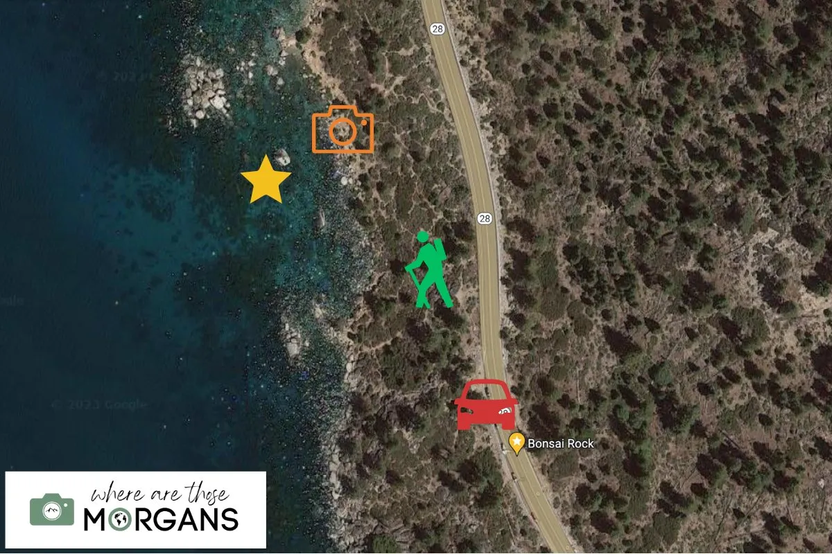 Open this Google Maps location into your smartphone and click directions to reach the roadside parking area. If it’s full in the pullover, your alternative is Sand Harbor but it has paid entry and you’ll need to hire a kayak to reach Bonsai Rock.