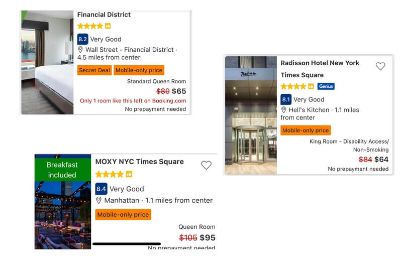 Example: We typically search for hotels on a Booking.com desktop browser because the screen is bigger and it has a better user experience. However, we always check our Booking.com mobile app to see if any hotels we like are cheaper with mobile only prices.