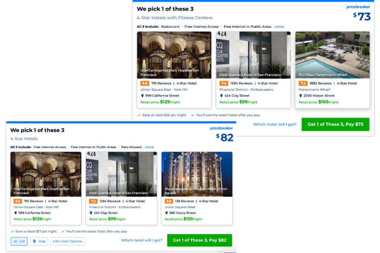 Example 2: Using the Pricebreakers function on Priceline, they select 3 similar hotels (4*, including fitness center etc) and give you one list price. You can see the names of the three hotels and you pay the list price without knowing which of the 3 hotels you will be given until after confirmation.