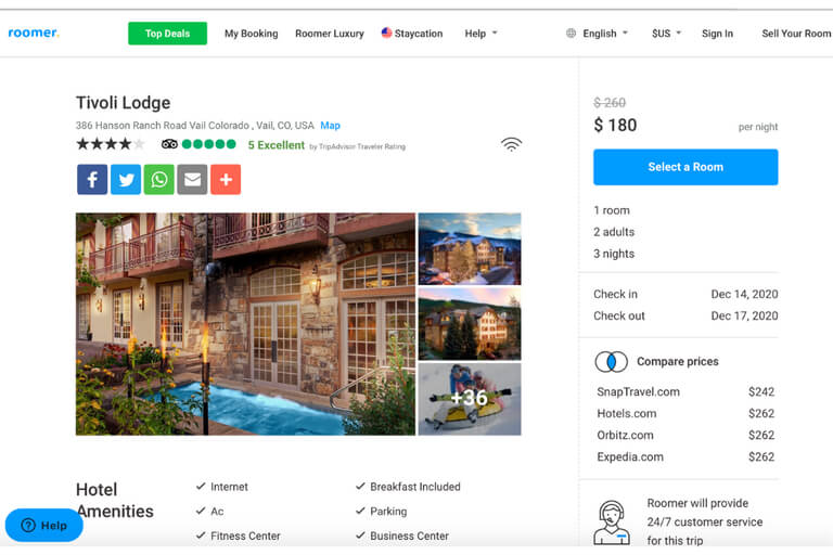 Example: You book a non-refundable room at Tivoli Lodge hotel in Vail, Colorado for a few days on the slopes in December but something comes up last minute. Instead of losing $260 per night for 3 nights on your hotel room, you advertise the room on Roomer, where other visitors to Vail can snag your room at a discounted price of $180 per night.