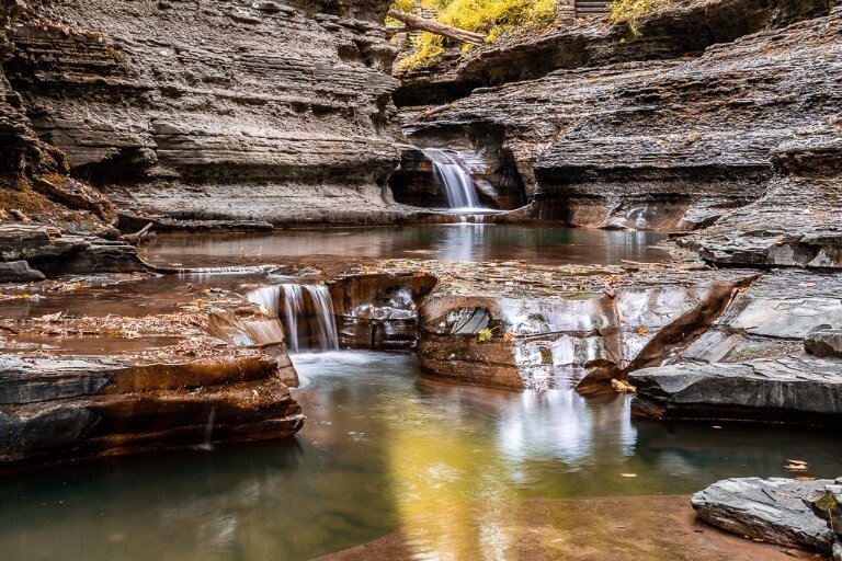 Before long, you’ll reach the most beautiful part of Buttermilk Creek. Water snakes intricately through the gorge, carving through dark rock and plunging gently from shelf to shelf. Look at how the deep green foliage of early fall contrasts wonderfully against the dark and sharp rock formations.