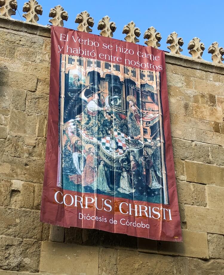 Cordoba has an annual carnival, usually towards the end of February or beginning of March. The Andalusian’s celebrate Corpus Christi on the first Thursday after Trinity Sunday each year. We were lucky enough to be there in 2018 and the photo above shows a banner hanging from the walls of the Mezquita.