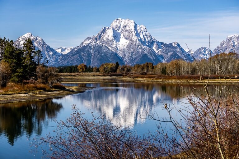 Immediately after finishing our seriously action packed 4 days in Yellowstone itinerary in October 2019, we drove south for the Tetons. We were tired and running on fumes, but very excited to see what Grand Teton would bring. And it ended up being two of our all-time favorite days since we began traveling the world in 2018. The rugged snow capped Teton Mountains and picture-perfect glacial lakes instantly reenergized us, and we were ready to go.