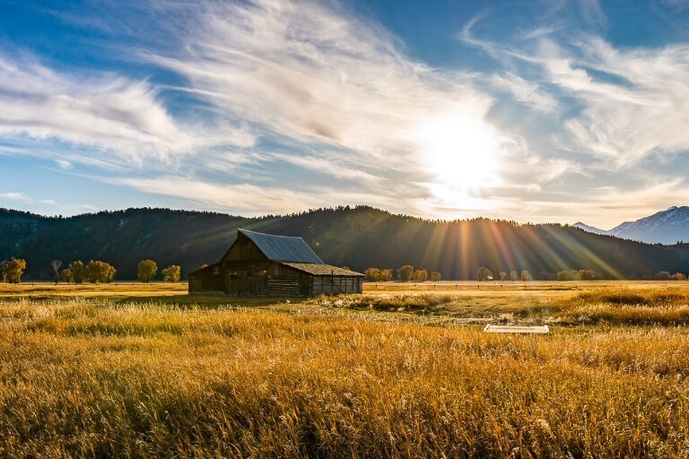 Check sunrise times at your Jackson hotel the night before beginning your first day. Grab a coffee in the hotel lobby, and don’t forget a packed lunch with plenty of snacks and fluids (which you should also sort out the day before). Hit the road and arrive at Mormon Row at least 30 minutes before sunrise. We think T.A. Moulton Barn is more photogenic, so we recommend driving straight to its small parking area on Gros Venture Road.