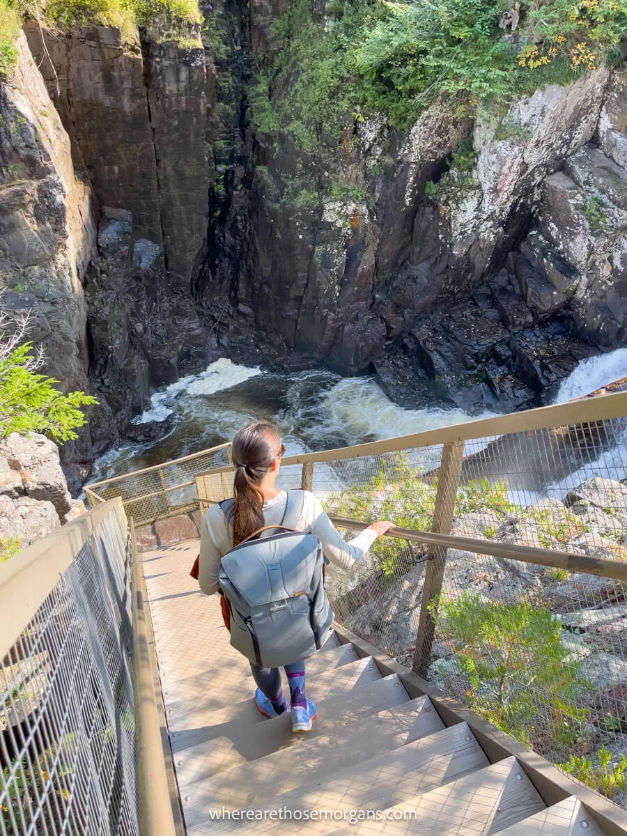 We went back up the steps and then crossed the river on a long metal bridge. On the other side, we looked back through trees and overgrown vegetation to see different perspectives of Main Falls. Next, the trail descended and turned back on itself, with views of the boardwalk on the other side which we’d get to later. The trail then zig-zagged through the forest for a few minutes with no views.