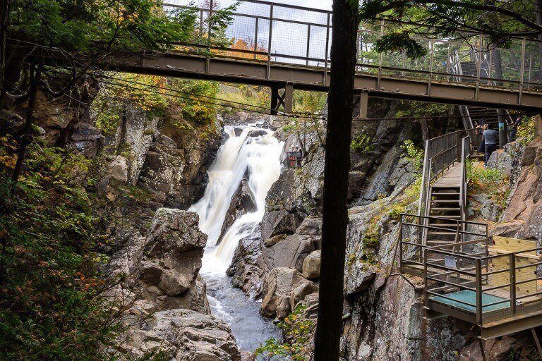 Eventually we reached another bridge crossing the river and when we looked to the left we immediately realized this was the best viewpoint in High Falls Gorge. It was a pretty awesome scene with Mini Falls, Rainbow Falls and Climax Falls all crashing through the narrow bottlenecked ravine. We took a bunch of photos and spent a few minutes watching the powerful waterfall.