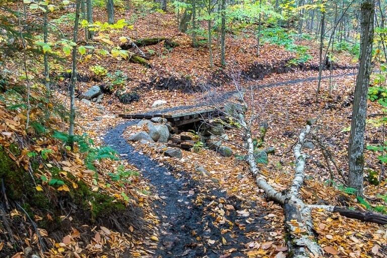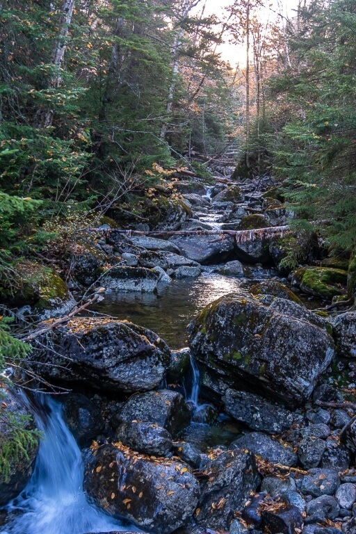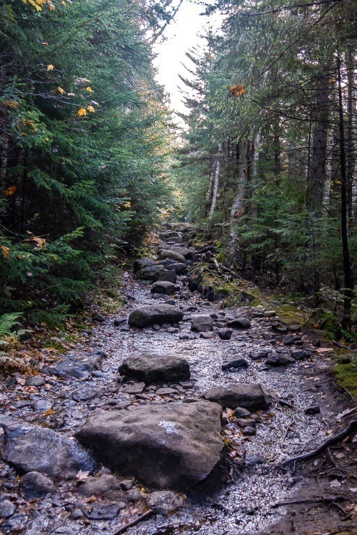 We started hiking Van Hoevenberg Trail for Mt Marcy at around 5:45 am and we were in complete darkness, so we had headlamps on. If you hike in spring or summer you’ll likely be in daylight by now, but check sunrise times to see if you need to pack headlamps. The first part of the trail through dense forest with wooden bridges and boardwalks was easy, flat and picturesque. It had a serious Narnia vibe.