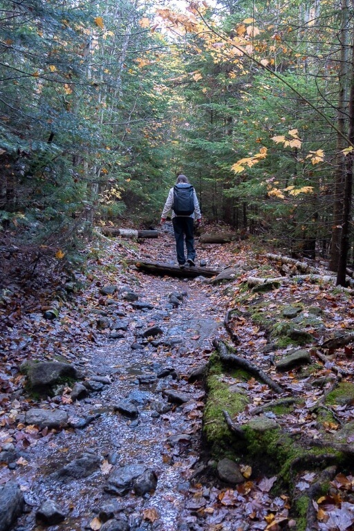 We had to take care because the rocks were slippery, the leaves were slippery, and going downhill can be tough on the knees and ankles. The worst part was keeping our concentration 8 hours into the hike as we walked the last hour back to the parking lot. It only takes one tired misplaced step to have a fall. But, we finally made it and 30 minutes later we were sipping cold beers in Lake Placid!