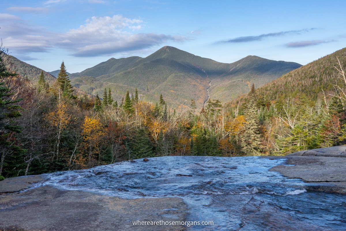 Lowe running waterfall cascading over a shelf with far reaching views over trees and hills at Indian Falls on the Mount Marcy hike in New York