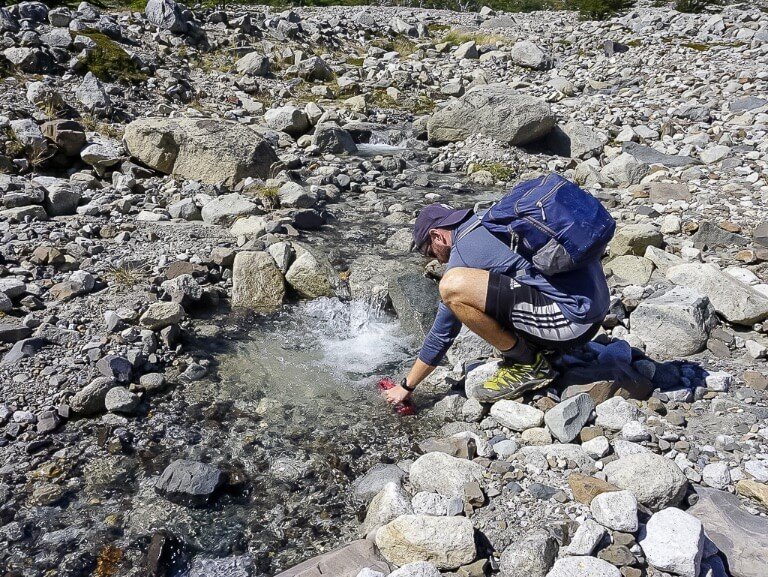 According to REI, a good rule of thumb is to drink about half a liter of water for every hour of hiking. But water can weigh a lot so it’s best to plan your hiking route around water availability. For shorter hikes, you can easily carry enough water. We use a combination of Nalgene bottles and hydration reservoirs. But for longer hikes, you might need a water treatment option such as a LifeStraw when refilling from a lake or stream.