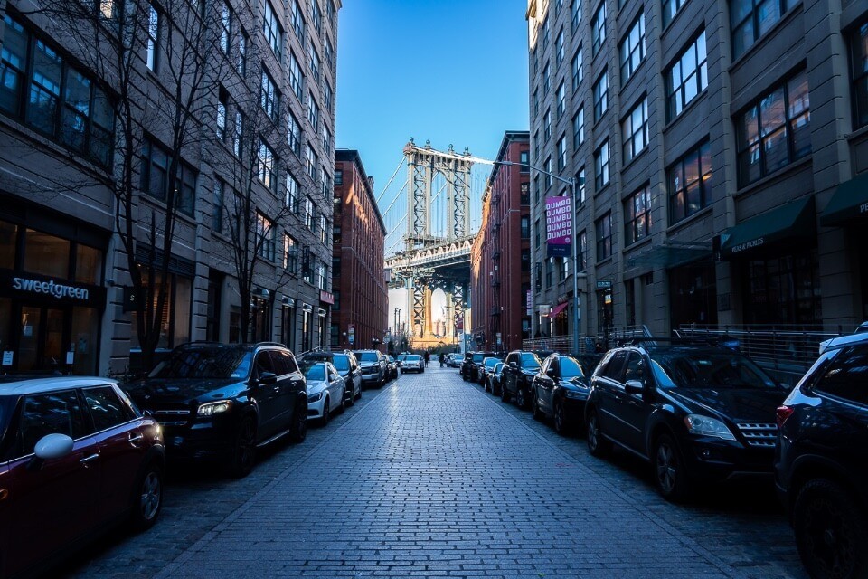 A gradual downhill road made up of picturesque cobblestones leads your gaze through a narrow gap between the buildings. Your eyes will be drawn to the looming Manhattan Bridge tower standing directly in front of you, proud and prominent.