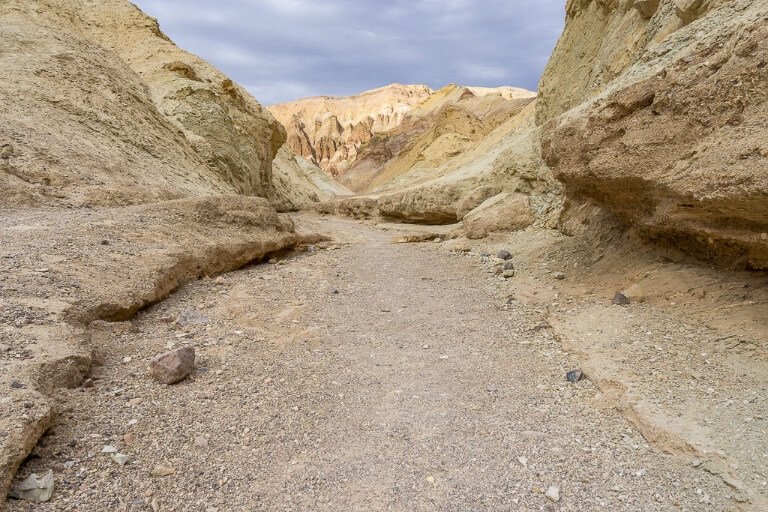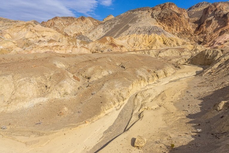 Zabriskie Point is one of the most popular viewpoints in Death Valley. It’s a wide open vista overlooking colorful undulating mounds and dramatic mountain ranges in all directions, and this is where you’ll start your day. The viewpoint has a large parking area and it’s easy to access, but it gets busy. Sunrise and sunset are the best times of day to visit Zabriskie Point when the light is soft and the mounds are vibrant.