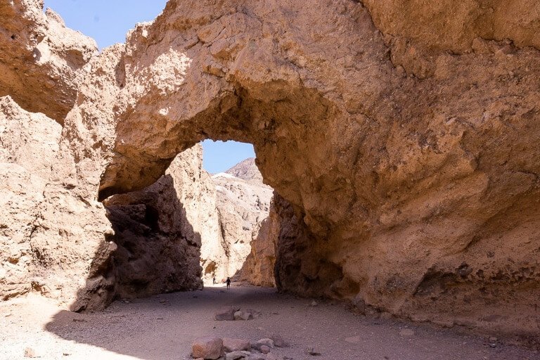 Turn around and drive 3.5 miles back up Badwater Road. Take a right turn onto Natural Bridge Road, cut through desert for 1.5 miles on a dirt road and park in the large lot at the end. Natural Bridge Trail is a moderately difficult 2-mile roundtrip hike that carves through a canyon to a bridge-like rock formation and a handful of dried out waterfalls.