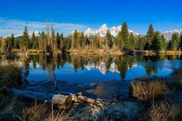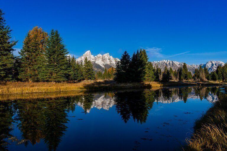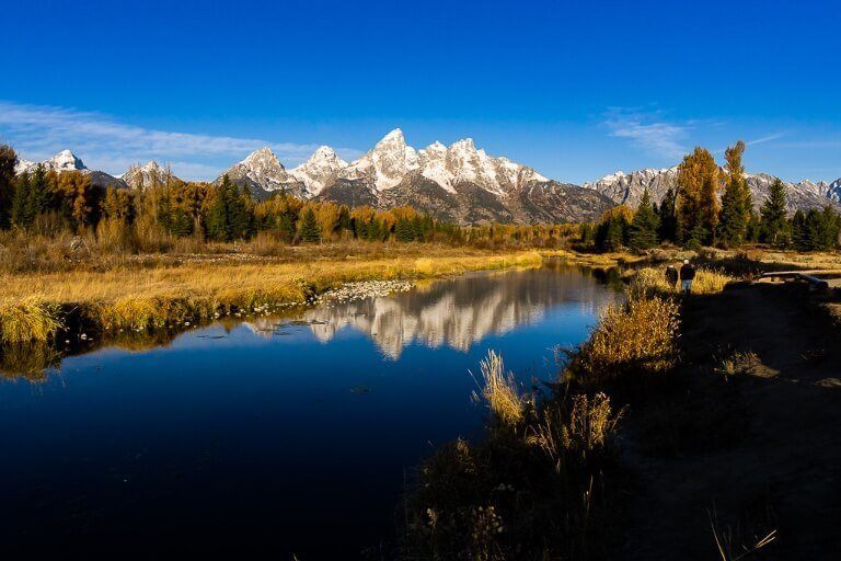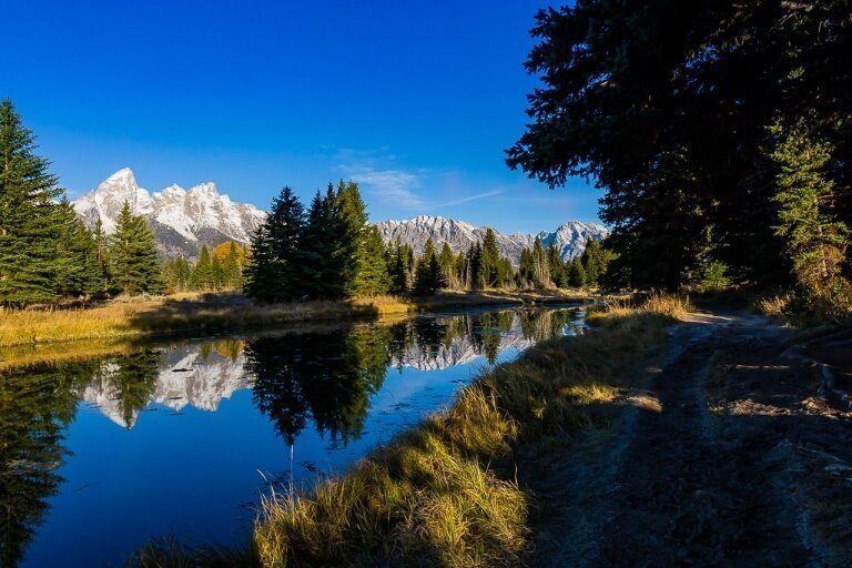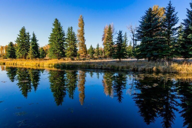 Then you’ll walk along a flat dirt path hugging the Snake River for a few minutes until hitting a dead end. But we can guarantee those few minutes of walking will be some of your favorites because you’ll have non-stop pristine reflections in the river. If there’s one single location showcasing the immense natural beauty in Grand Teton, we’d say it’s here at Schwabacher Landing.