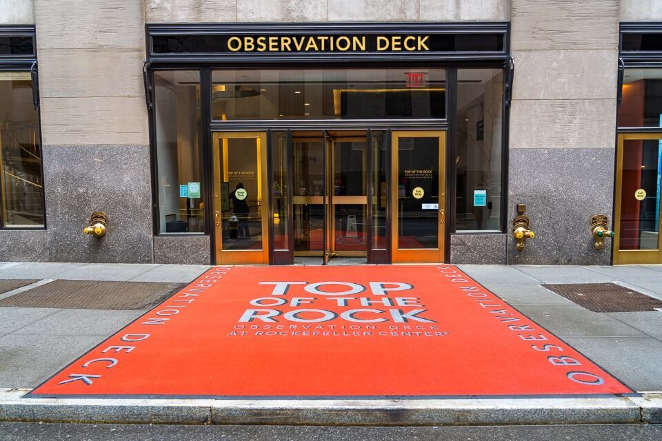The entrance you need for the observation deck is on W 50th Street, closer to 6th Avenue and opposite Radio City. Here’s the exact maps location. Look for a bright red carpet leading into revolving doors with the word “ticketing” above.