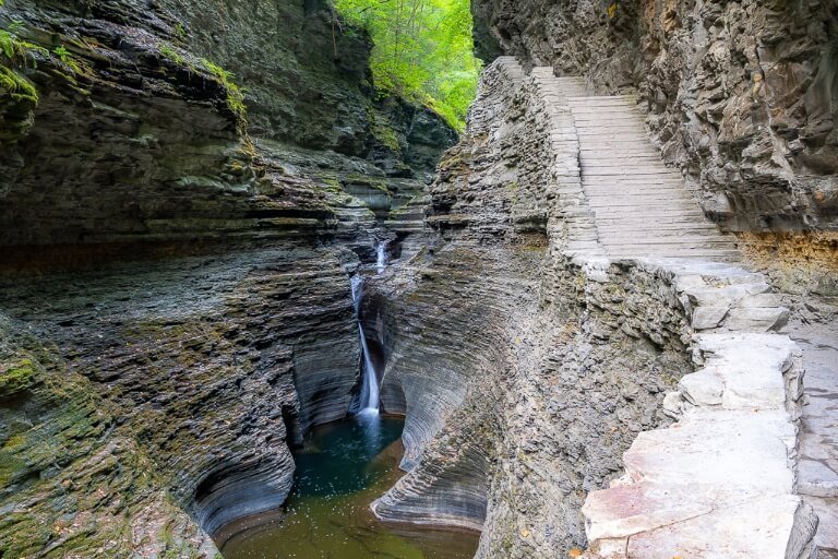 Watkins Glen State Park is home to one our favorite hidden gem photo spots in the entire US – Rainbow Falls. Kristen grew up in western New York and we spent our covid lockdown year in the Finger Lakes, so we’ve hiked the mesmerizing gorge trail more times than we can count. One thing we can tell you for sure is that walking through this genuinely postcard-perfect place never gets old!