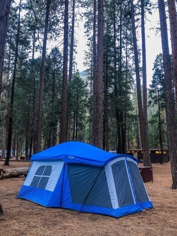 Photo of a large blue tent surrounded by trees on a ground covered in pine needles next to a small bench in Yosemite Upper Pines Campground
