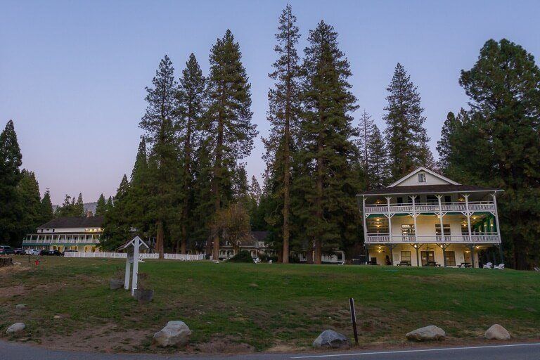 Photo of the Wawona Hotel in Yosemite surrounded by trees from the road at dusk