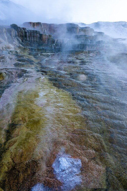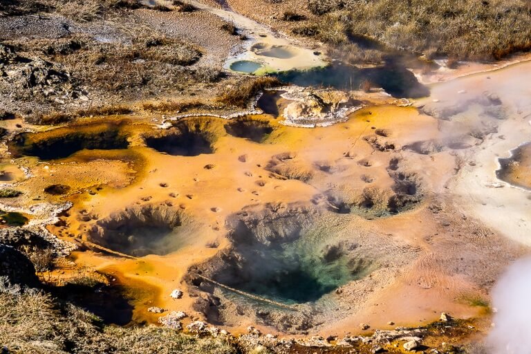 Stop just 1 mile further up the road and hike Artists Paintpots Trail to see bubbling mud pots and lots of small orange springs. Itâs one of our favorite lesser known spots in the park, so donât miss it. Continuing north, the next stop is Norris Geyser Basin which takes quite a while to get around. Norris is split into 2 sections called Back Basin and Porcelain Basin. It doesnât matter which section you visit first, but donât miss Steamboat Geyser (tallest geyser in the world) and Echinus Geyser (largest acid-water geyser).