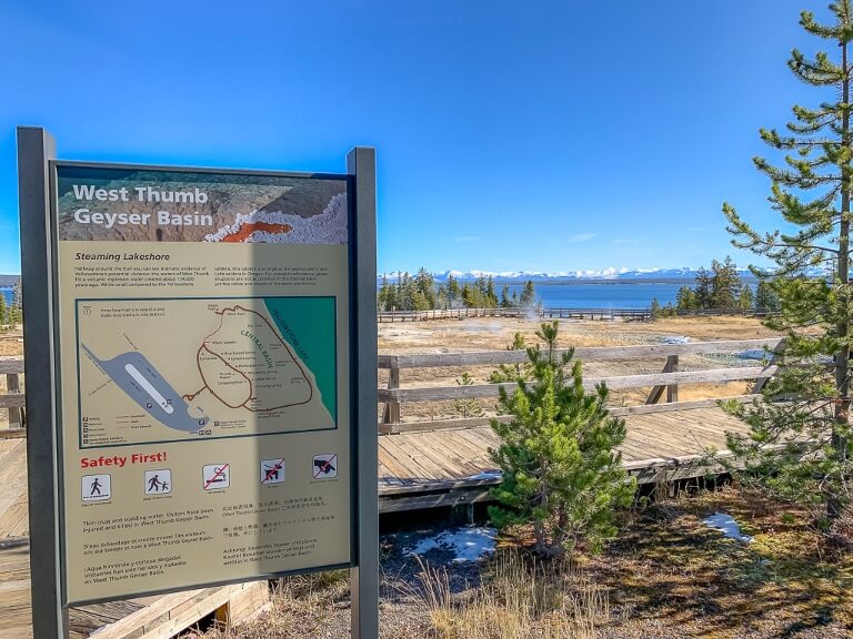 After the valley youâll arrive at Yellowstone Lake. You could hike Storm Point for a close up of the lake, otherwise continue down to West Thumb Geyser Basin. We really like West Thumb and think itâs one of the more underrated basins. Take a good walk around and enjoy the unique geothermal features, with stunning views over distant mountains. Consider hiking Yellowstone Lake Overlook Trail. Drive to Old Faithful and stay there, or stay in West Yellowstone.