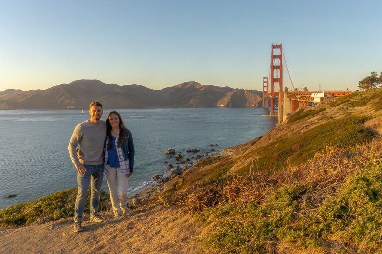 Couple standing together on a sloping cliff with views of the Golden Gate Bridge and San Francisco Bay in the background at sunset