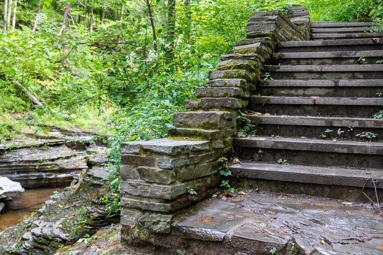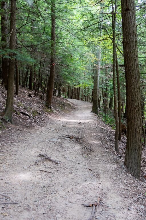 After you pass by the top of Buttermilk Falls and the Falls Overlook, the trail veers out from Buttermilk Creek and becomes a steep dirt path. You won’t be able to see much from this section of the trail, but take your time and watch your footing as this section can be tricky.