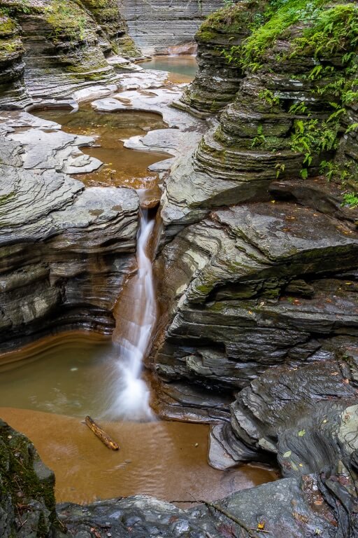 Although this part of the gorge is slightly less dramatic, we don’t want to do the rest of the trail an injustice. There are still lovely wispy waterfalls and ledges to enjoy as you descend the final sections. Notice how much more smooth and rounded the creek is here when compared to higher up?
