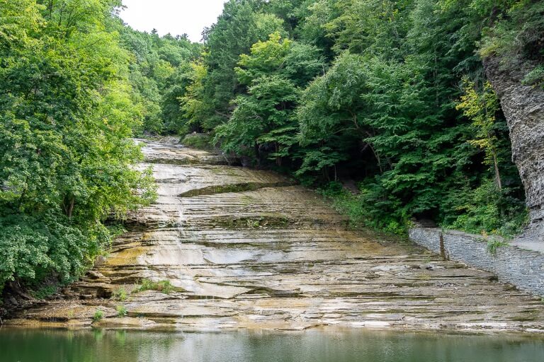 If you visit in fall after a summer drought like we did, you won’t find more than a trickle running down the giant tiered rock face. But in spring and early summer, Buttermilk Falls is much more lively and impressive.