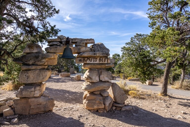 At Hermit’s Rest you’ll find a historic stone structure that once served as a resting place between Grand Canyon Village and the Hermit Trail. On site there’s a gift shop, a coffee and snack bar, a huge fireplace and the westernmost views you can see into Grand Canyon. We bought hot chocolates and sat next to the fire.