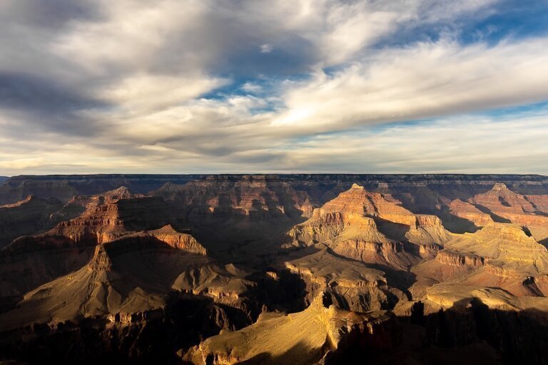 Sunrise is the most magical time of the day at Grand Canyon National Park. It’s peaceful, calm and spectacularly colorful if you get lucky with the clouds. Mather Point is the most popular place to watch the sunrise over South Rim because it’s easy to access and has stunning east facing views.