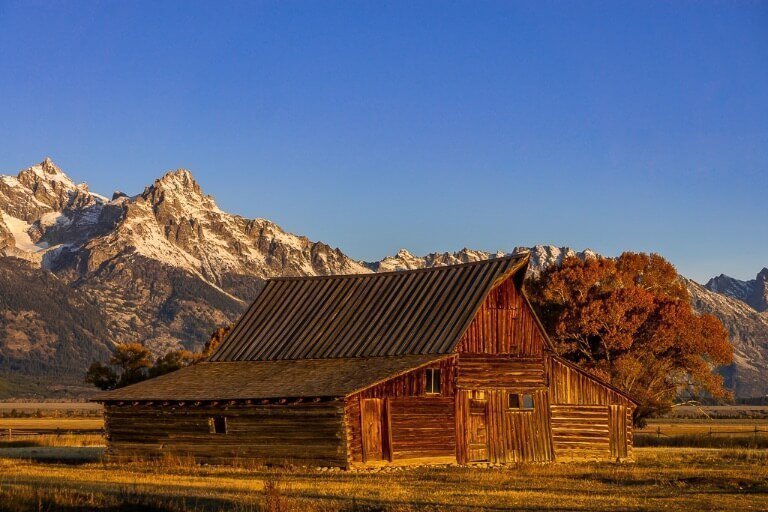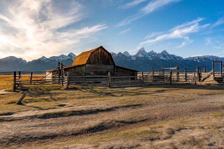 Check sunrise times at your Jackson hotel the night before beginning your first day. Grab a coffee in the hotel lobby, and don’t forget a packed lunch with plenty of snacks and fluids (which you should also sort out the day before). Hit the road and arrive at Mormon Row at least 30 minutes before sunrise. We think T.A. Moulton Barn is more photogenic, so we recommend driving straight to its small parking area on Gros Venture Road.