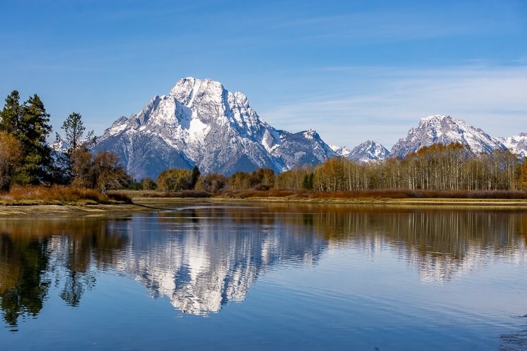 Immediately after finishing our seriously action packed 4 days in Yellowstone itinerary in October 2019, we drove south for the Tetons. We were tired and running on fumes, but very excited to see what Grand Teton would bring. And it ended up being two of our all-time favorite days since we began traveling the world in 2018. The rugged snow capped Teton Mountains and picture-perfect glacial lakes instantly reenergized us, and we were ready to go.