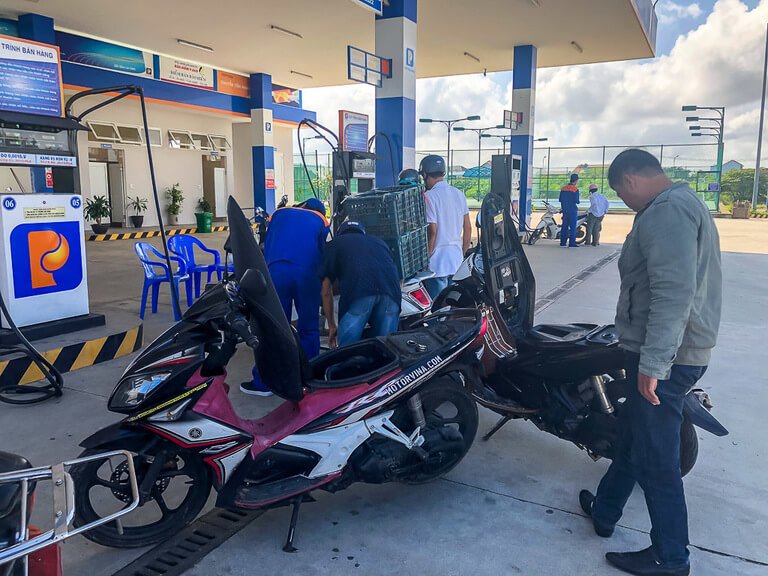But we needed to fill up the tanks. Phu led us into a real gas station and handled the fueling up while we shared a laugh of relief at each other for getting through the traffic in Hue as our hearts were beating much quicker.