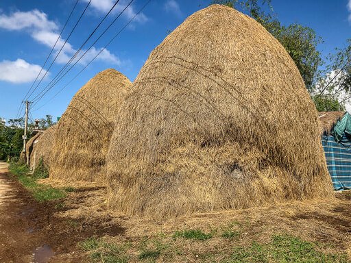 Now, in place of motorbikes as potential hazards, we had to look out for loose chickens, children and rogue goats. We stopped to admire some large straw structures with chicken coops inside. We also met a woman catching snails and she showed us her lucky technique.