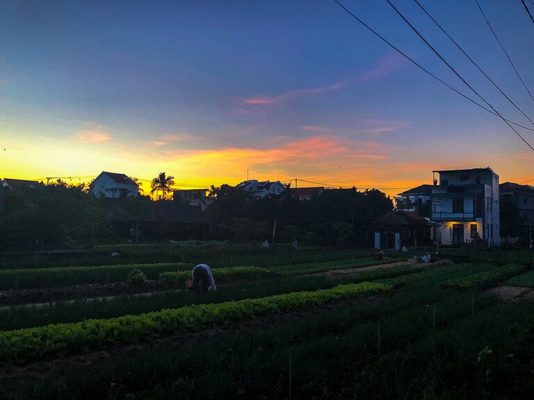 The final stretch of road towards Hoi An was busy and natural light was failing as night approached. But Phu knew a few shortcuts on very narrow roads running between rice paddies in the countryside outside Hoi An town. He took us for a very brief stop off at a friends curated and lush green garden. Before we knew it, we had arrived in Hoi An at the office.