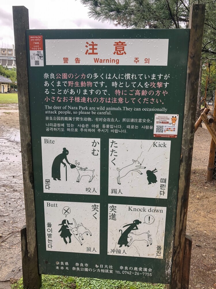 One of the first things we noticed was the warning sign pictured above saying “The deer of Nara Park are wild animals. They can occasionally attack people, so please be careful.” After reading it, we both gave each other nervous smiles trying to figure out how a deer could attack a person.