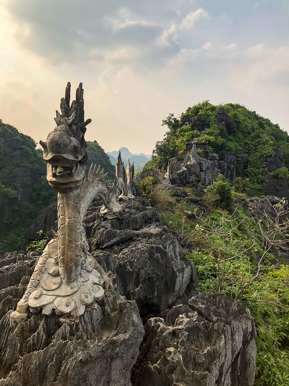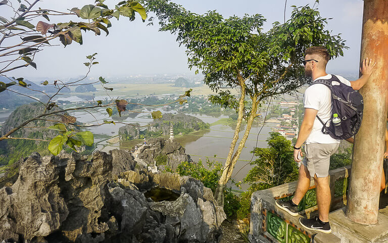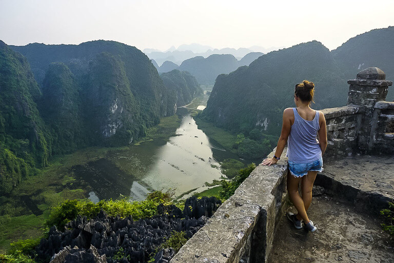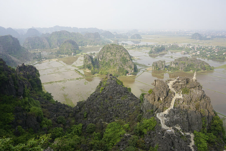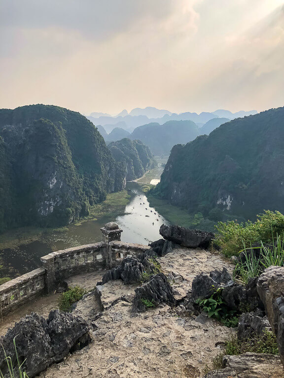 Look west and you’ll see the Ngo Dong River flowing through a range of limestone mountains wrapped in deep green vegetation. The river will be dotted with wooden boats and farmers tending to their rice crops on the river banks. To the east, you’ll see views over a lower viewpoint at Mua Cave, plus industrial Ninh Binh city in the distance.