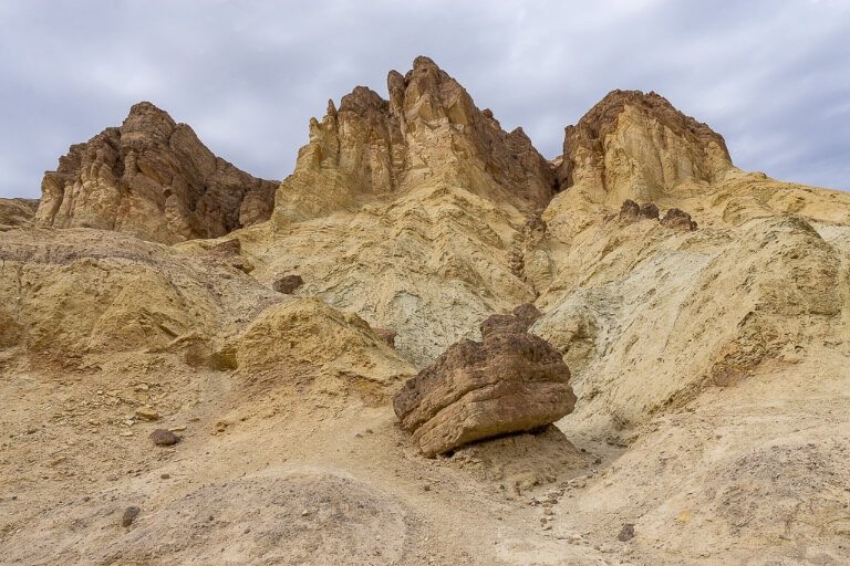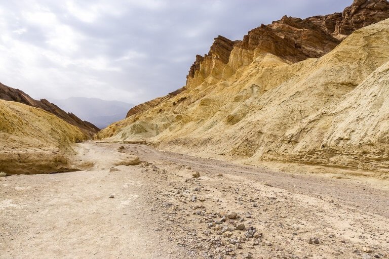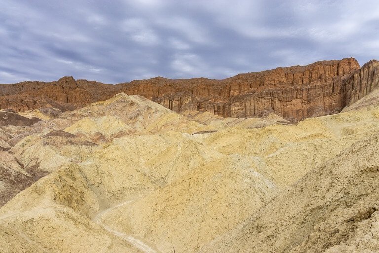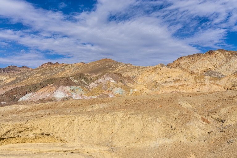 Zabriskie Point is one of the most popular viewpoints in Death Valley. It’s a wide open vista overlooking colorful undulating mounds and dramatic mountain ranges in all directions, and this is where you’ll start your day. The viewpoint has a large parking area and it’s easy to access, but it gets busy. Sunrise and sunset are the best times of day to visit Zabriskie Point when the light is soft and the mounds are vibrant.