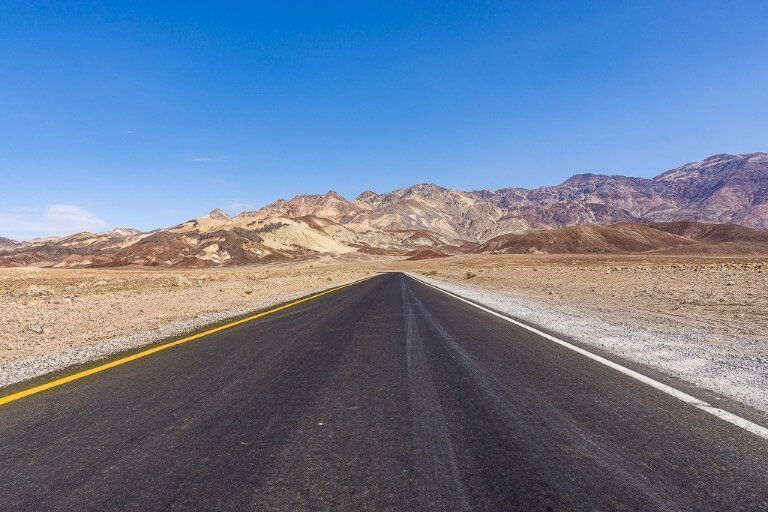 Get back on Badwater Road heading north and take a right turn onto the one-way Artists Drive just 2.5 miles later. This loop drive is one of our favorite spots in Death Valley because it’s scenic, the road is fun to drive and it leads to Artists Palette which has some of the most colorful mounds in the park.
