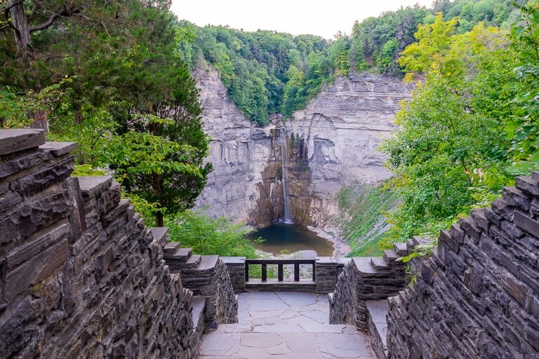 After hiking the Gorge Trail, your next stop should be the Taughannock Falls overlook. It features a beautifully crafted stone staircase creating a postcard perfect image. We think the Taughannock Falls viewpoint is one of the best photography locations in the entire state park. But depending on the time of year you visit, the waterfall will look very different.