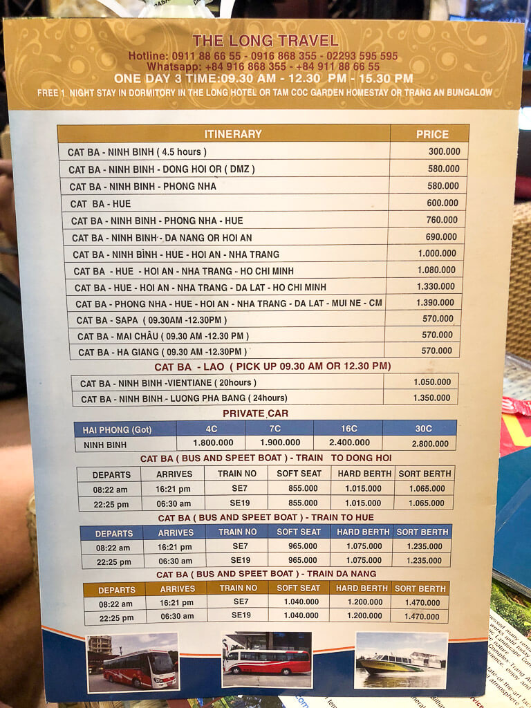 After we purchased our tickets with a travel agency, we heard them sell tickets to the couple behind us for 250,000 VND ($10) more each for the exact same route. If you chose to go this way, you will need to negotiate.