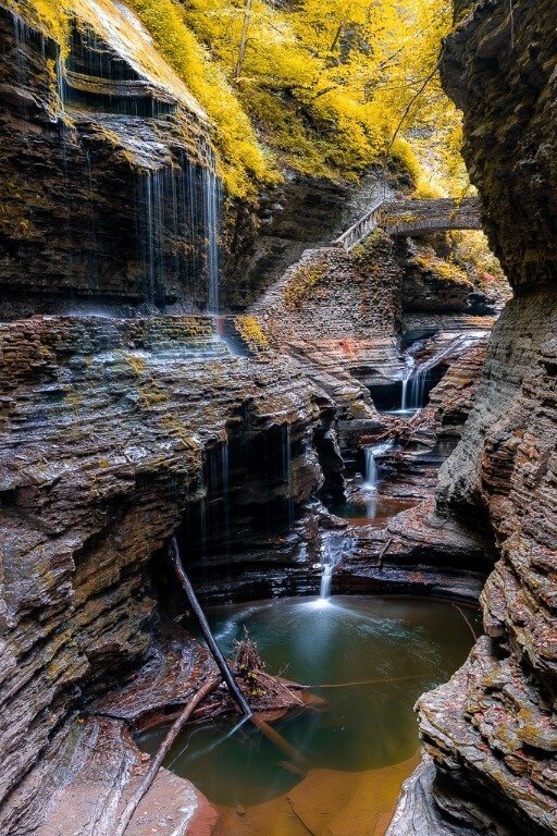 Picture nineteen waterfalls plunging through a deep and narrow gorge, complimented by exquisitely crafted human made stone staircases and bridges. No, you haven’t been summoned to the council of Elrond in Rivendell, you’re hiking up Glen Creek gorge to Rainbow Falls inside Watkins Glen State Park, the crown jewel of New York’s Finger Lakes region.