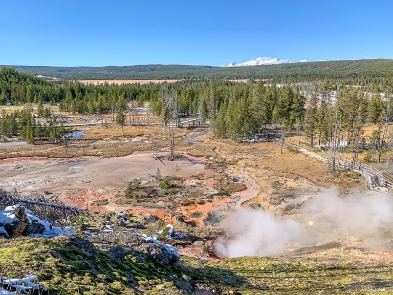 Stop just 1 mile further up the road and hike Artists Paintpots Trail to see bubbling mud pots and lots of small orange springs. Itâs one of our favorite lesser known spots in the park, so donât miss it. Continuing north, the next stop is Norris Geyser Basin which takes quite a while to get around. Norris is split into 2 sections called Back Basin and Porcelain Basin. It doesnât matter which section you visit first, but donât miss Steamboat Geyser (tallest geyser in the world) and Echinus Geyser (largest acid-water geyser).